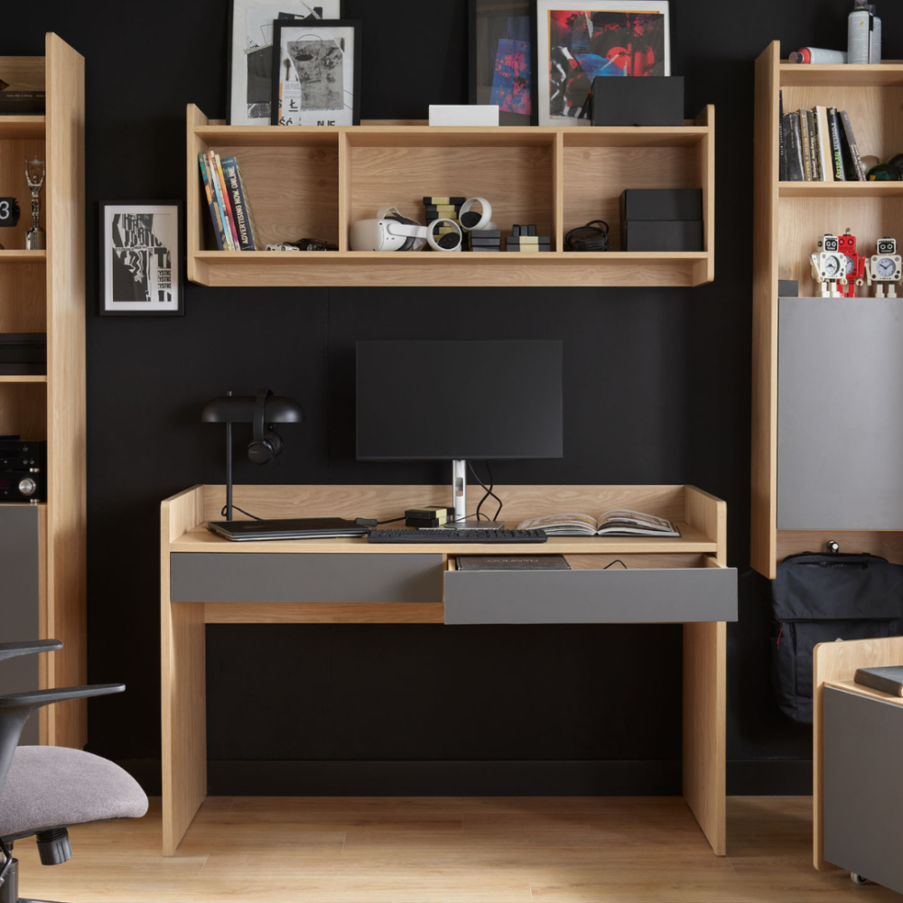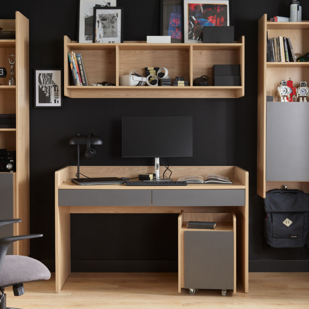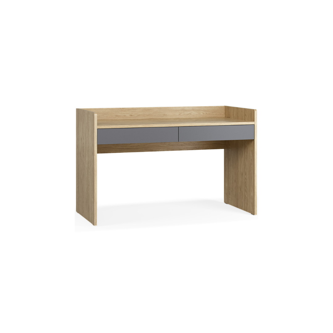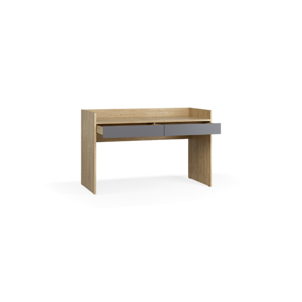 Liela, izturīga virsma un ietilpīgas atvilktnes palīdz uzturēt kārtību un organizēt nepieciešamās lietas. Šī ir funkcionāla mēbele, kas lieliski atradīs vietu bērna telpā un pavadīs viņu katrā augšanas posmā. Muve rakstāmgaldam ir plaša virsma 140 cm platumā, ko ieskauj paceltas sienas. Šis dizains rada ergonomisku mācību telpu un pasargā uz galda virsmas novietotos priekšmetus no nokrišanas uz grīdas. Zem galda virsmas ir 2 ietilpīgas atvilktnes aksesuāriem un sīkrīkiem, kurus ir vērts turēt rokas stiepiena attālumā. Augstas kvalitātes vadotnes ar klusu aizvēršanās sistēmu nodrošina ērtu to lietošanu. Galda virsmas aizmugurē ir noslēdzams padziļinājums ar kabeļu cilpu. Tajā var ievietot elektrības pagarinātāju un ērti sakārtot kabeļus un lādētājus, pasargājot tos no sapīšanās un putekļiem, kā arī sakārtojot vietu mūzikas atskaņošanai. Rakstāmgalda izskatu var personalizēt, izvēloties atvilktņu fasāžu krāsu. Izvēlieties eļļotu ozolkoka, smilšu bēša vai grafīta fasādi.