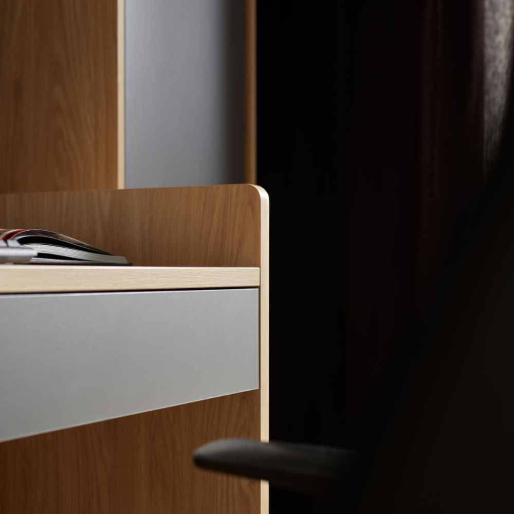 Ir vērts iegādāties mobilo pjedestālu rakstāmgaldam, kas kalpos kā skapis papildu priekšmetiem un iederēsies zem mēbelēm. Muve kolekcijā ir pieejams arī šaurāks rakstāmgalds ar regulējamu virsmas augstumu. Pateicoties VOXBOX programmai, jūs varat viegli pārbaudīt, kā Muve rakstāmgalds izskatīsies interjerā. Muve kolekciju veidoja Dominika Dreznere-Ilčuka.