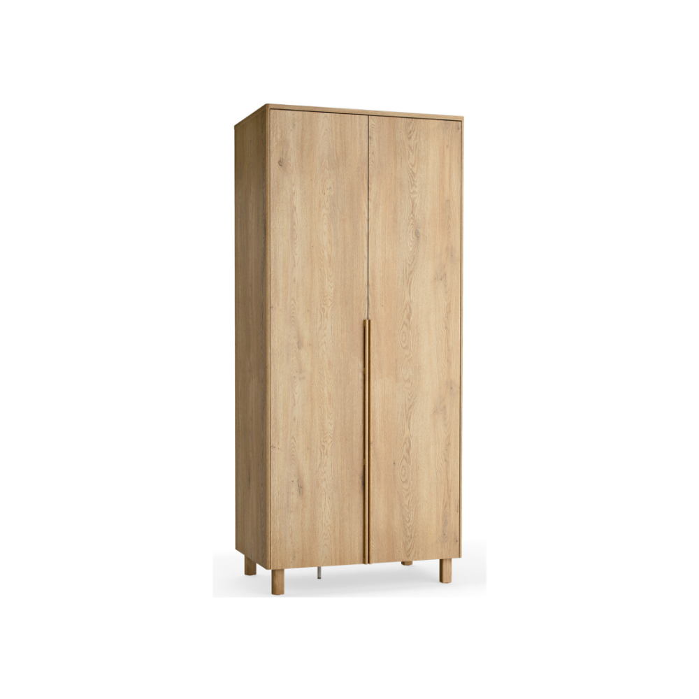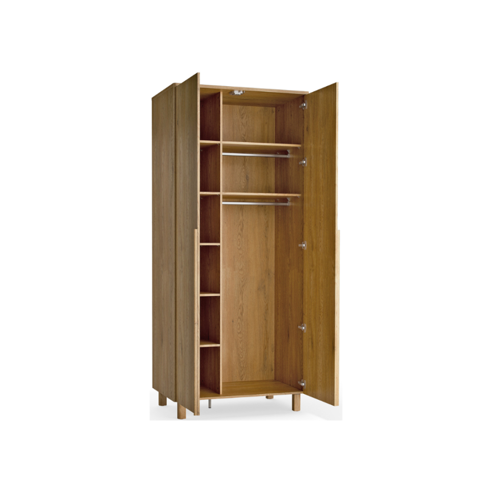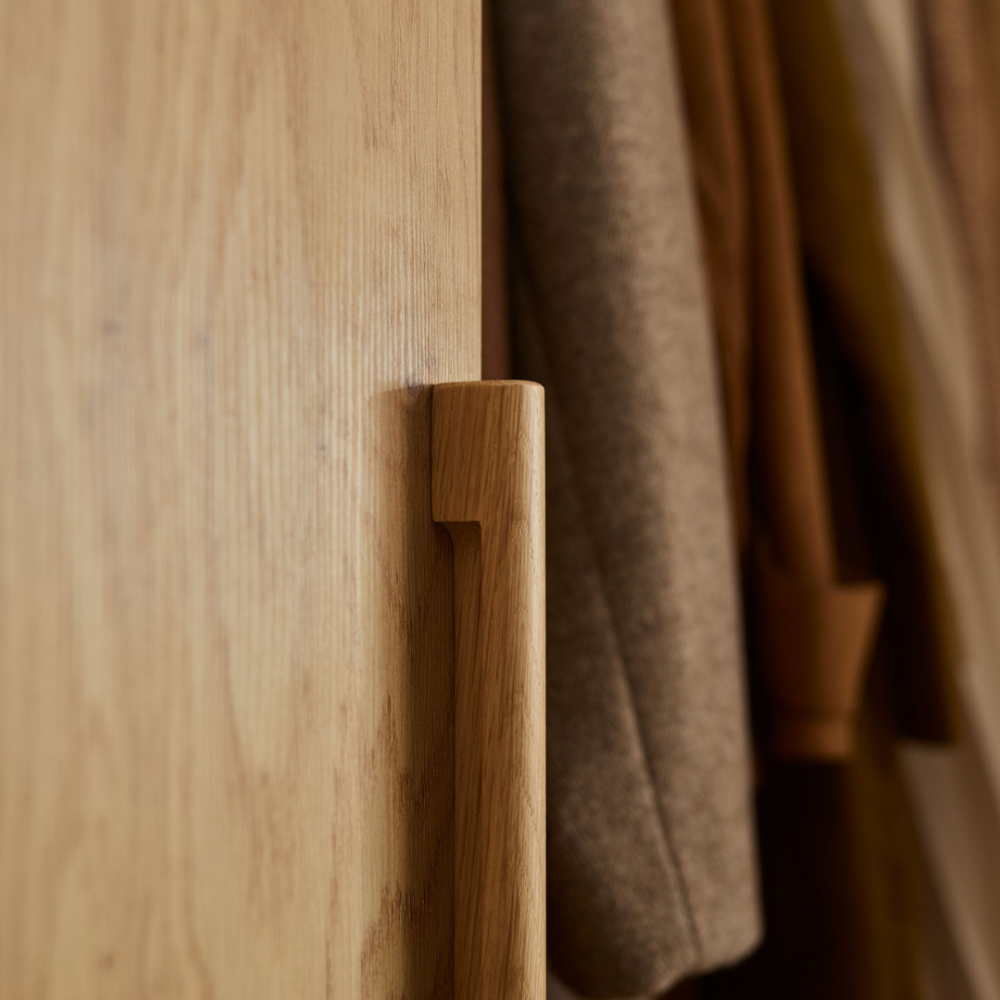 Garie, ergonomiskas formas ozolkoka rokturi ir dabisks fasāžu pagarinājums kas uzsver mēbeļu amatniecisko raksturu. Standarta variantā divdurvju skapis WELL ir uzstādīts uz peciņām ar filci grīdas aizsardzībai, un kā opciju var izvēlēties 13 cm augstas ozolkoka kājas. Mēbeles teicami saderēs ar citiem WELL kolekcijas elementiem, piemēram, ar gultu vai grāmatu plauktu. Lai izplānotu garderobes izvietojumu telpā, ir vērts izmantot  mūsu VOXBOX programmu.