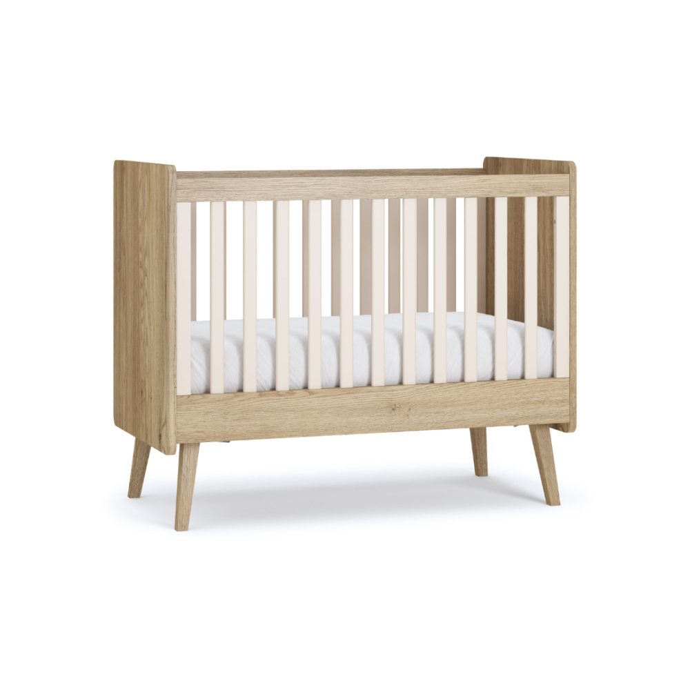 Tās raksturu uzsver harmonisks ozolkoka krāsas sānu un pakāpienu izvietojums elegantā bēšā svītrainā tonī. Mēbeles ir piemērotas 60×120 cm izmēra matračiem. Augstas sienas ar estētiski noapaļotiem stūriem nodrošina mazuļa drošību miega laikā. Grīdas augstums ir regulējams 3 līmeņos. Tas ļauj pielāgot mēbeles vecāku vajadzībām un bērna vecumam. Retro stila modelim ir garas diagonālas kājas. Tās nodrošina atbilstošu ventilāciju un gaisa cirkulāciju, samazinot alergēnus mazuļa vidē.