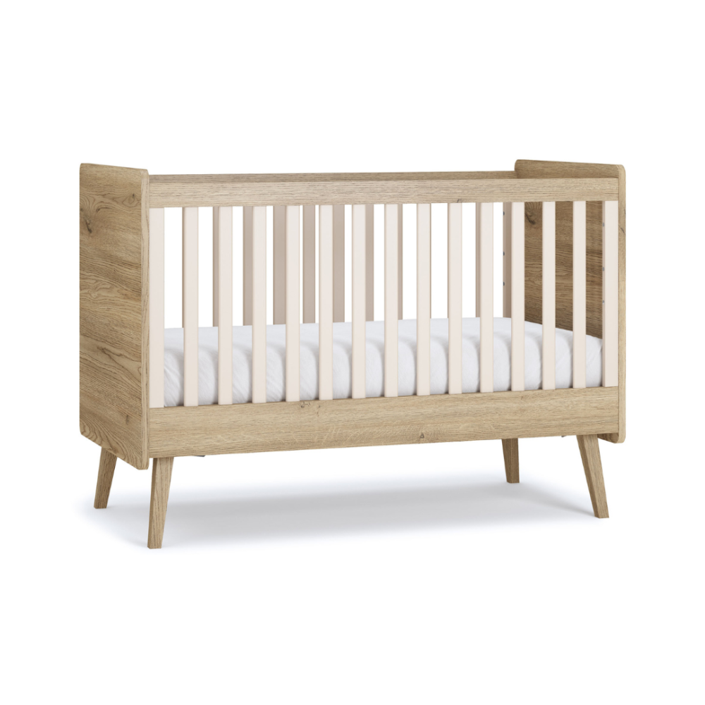Tās raksturu uzsver harmonisks ozolkoka krāsas sānu un pakāpienu izvietojums elegantā bēšā svītrainā tonī. Mēbeles ir piemērotas 60×120 cm izmēra matračiem. Augstas sienas ar estētiski noapaļotiem stūriem nodrošina mazuļa drošību miega laikā. Grīdas augstums ir regulējams 3 līmeņos. Tas ļauj pielāgot mēbeles vecāku vajadzībām un bērna vecumam. Retro stila modelim ir garas diagonālas kājas. Tās nodrošina atbilstošu ventilāciju un gaisa cirkulāciju, samazinot alergēnus mazuļa vidē.