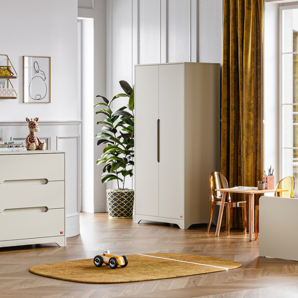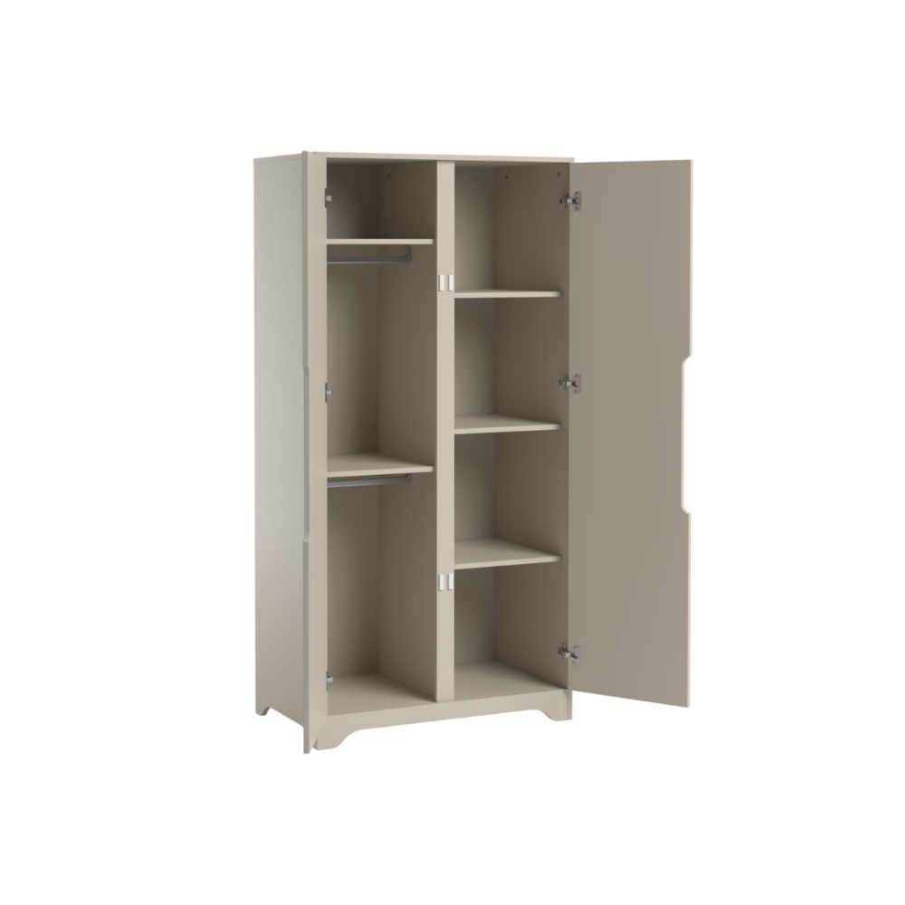 Siltie pelēkie/bēšie un baltie toņi radīs mājīgu atmosfēru telpā, kas ir ideāli piemērota relaksētai bērna guļamistabai. Vienkāršā un klasiskā skapja forma nodrošina pietiekami daudz vietas bērnu drēbju glabāšanai.