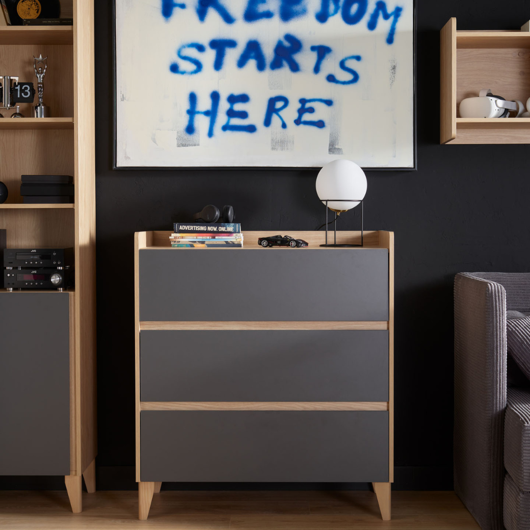 Praktiskā kumode no Muve kolekcijas ir obligāts organizatorisks elements pusaudžu un jaunāku bērnu istabās.