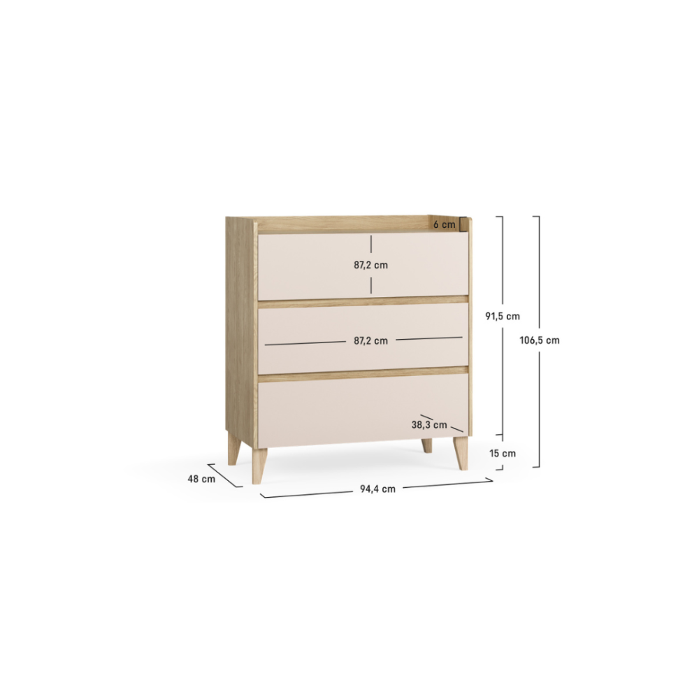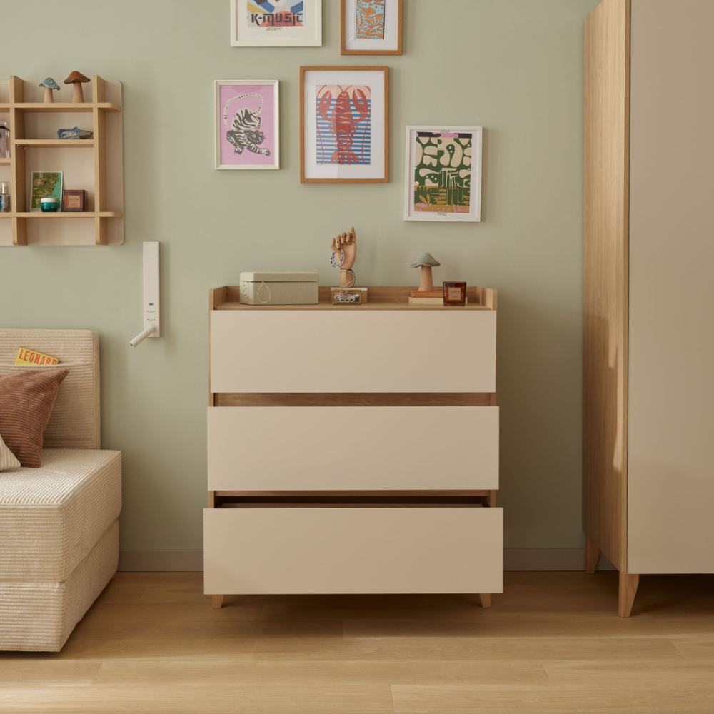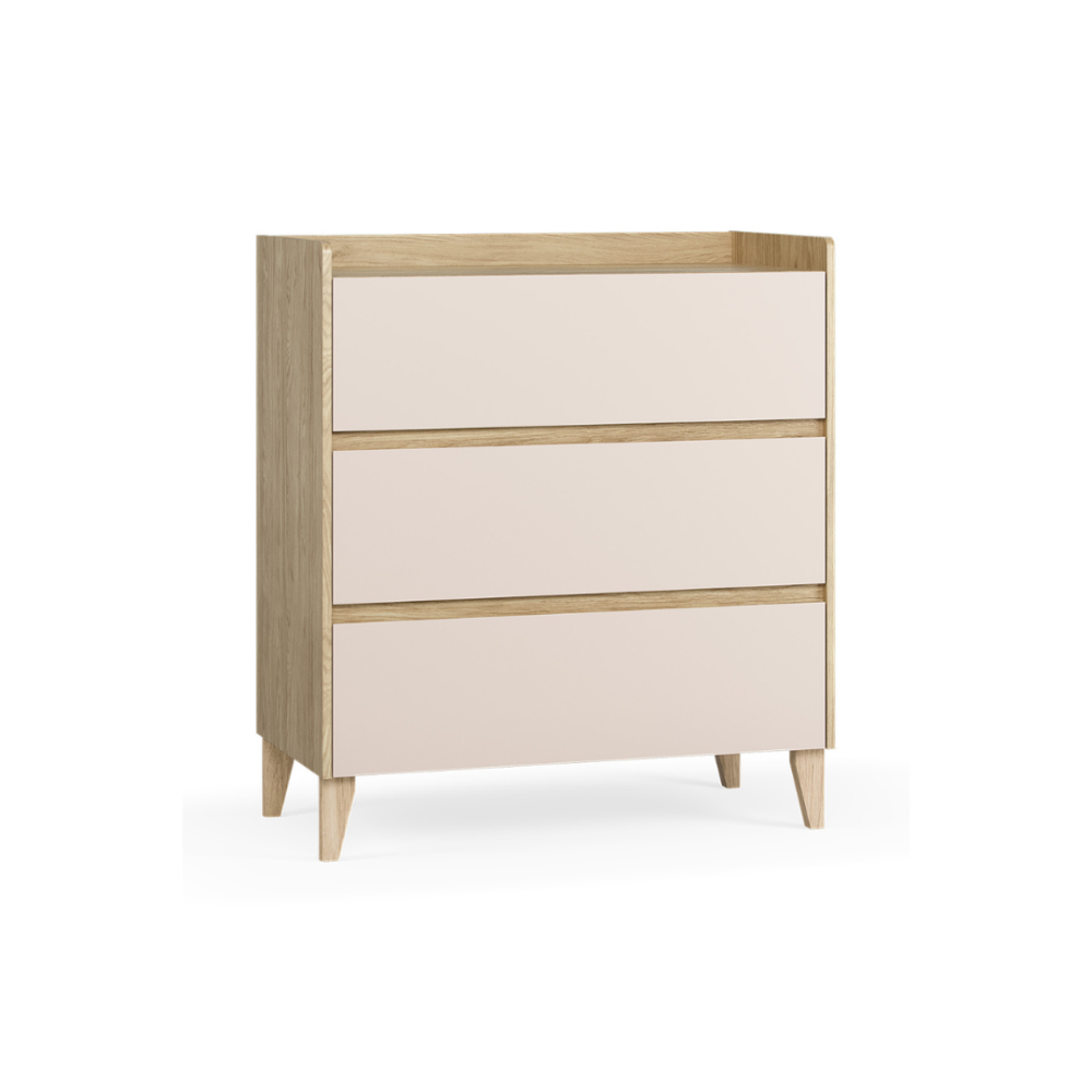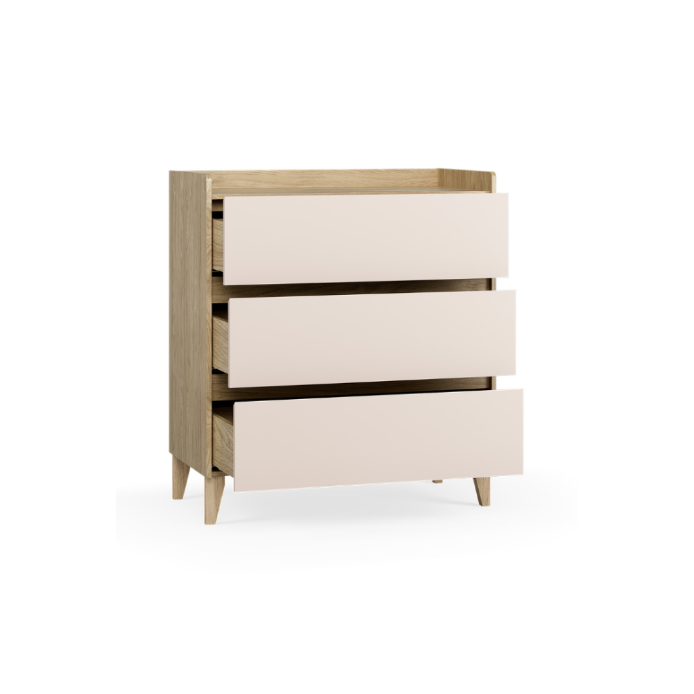 Ietilpīgās atvilktnes papildus drēbēm ļaus ievietot daudz rotaļlietu un aksesuāru, atvieglojot kārtības uzturēšanu. Izvēlieties fasāžu krāsu, lai mēbeles atbilstu jaunā īpašnieka stilam. Muve kumodei ir 3 atvilktnes. Tajās izmantotas augstas kvalitātes Hettich Quadro vadotnes, kas nodrošina vienmērīgu un klusu iebīdīšanu un izbīdīšanu. Augšējā atvilktne ir aprīkota ar praktisku organizatoru. Mēbeļu augšējo daļu var izmantot kā papildu plauktu. Paceltās malas pasargās komplektā iekļautos priekšmetus no nejaušas nokrišanas. 15 centimetru masīvkoka kājas nodrošina mēbelēm stabilitāti. Pateicoties tām, telpu ir vieglāk izsūkt ar putekļsūcēju, un kumode izskatās eleganta un viegla.