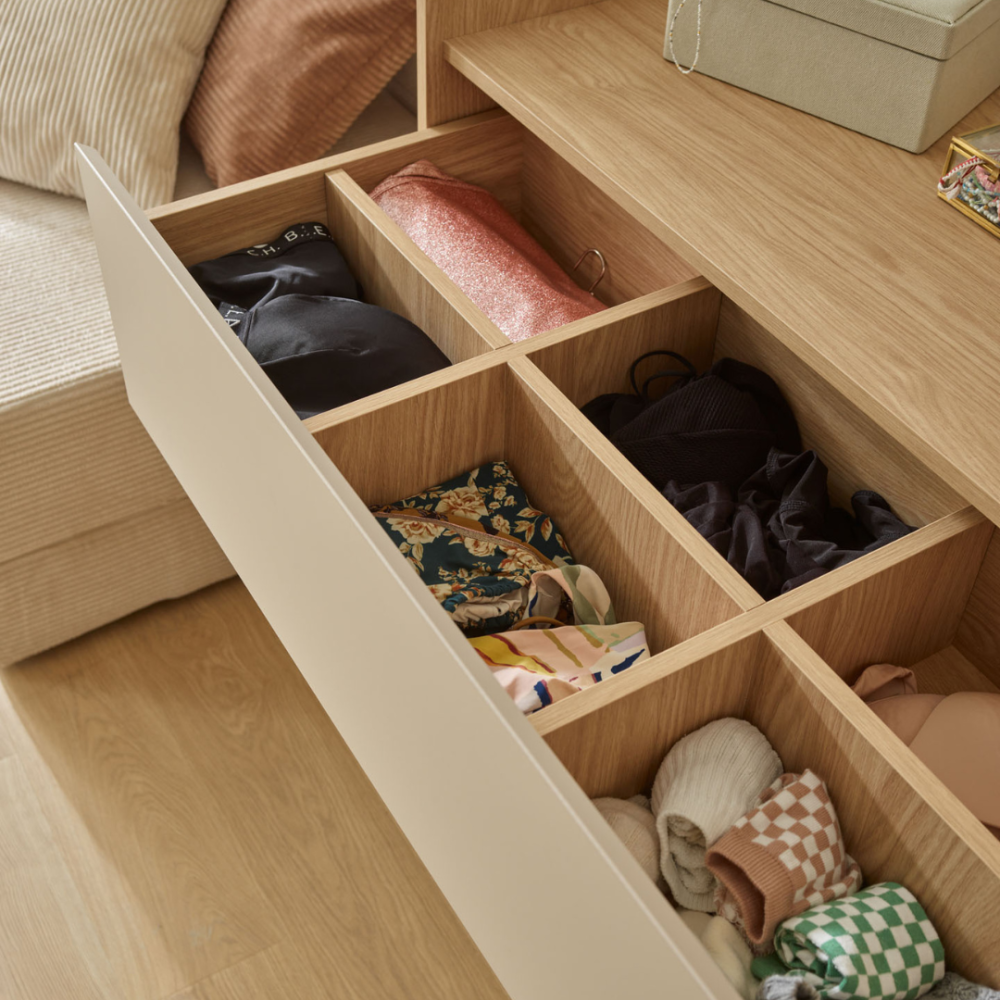 - Atvilktņu fasādes un korpusa sāni pieejami trīs krāsās: eļļots ozols, smilšu bēšs un grafīts.