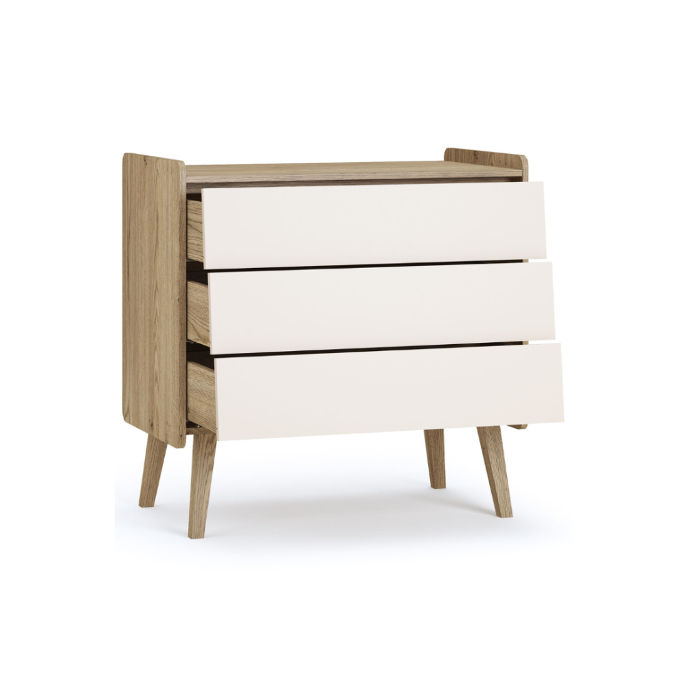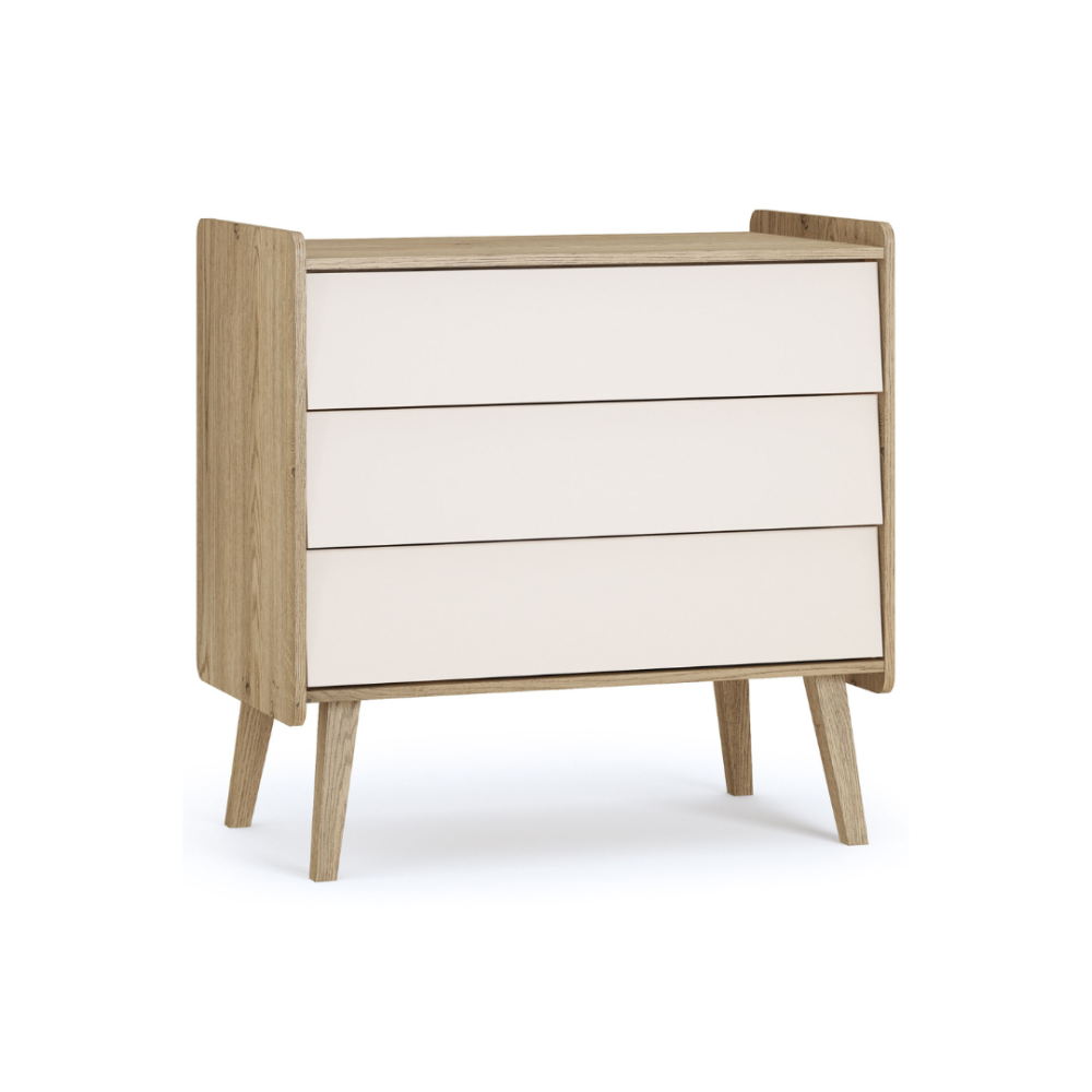 Vintage Fresh kolekcijas kumode, kas aprīkota ar 3 ietilpīgām atvilktnēm, paredzēta bērnu istabām un guļamistabām ar mazuļa stūrīti.