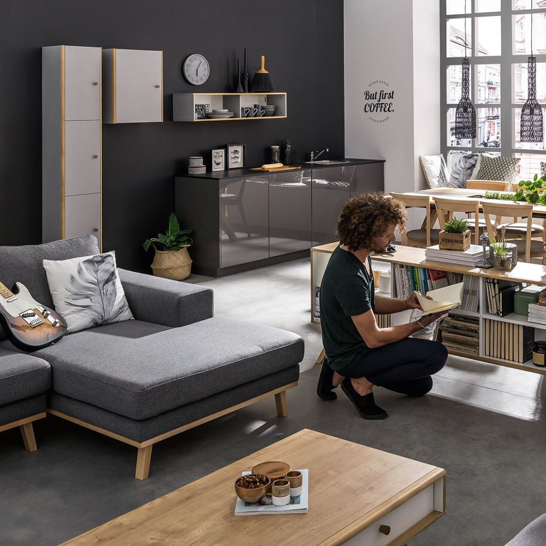 - Stabs ir pieejams trīs krāsās. Ozolkoka ārējais dekors tiek kombinēts ar baltu iekšējo apdari. Savukārt baltās mēbeles iekšpusē ir no ozolkoka. Varat izvēlēties arī pilnīgi pelēku variantu.