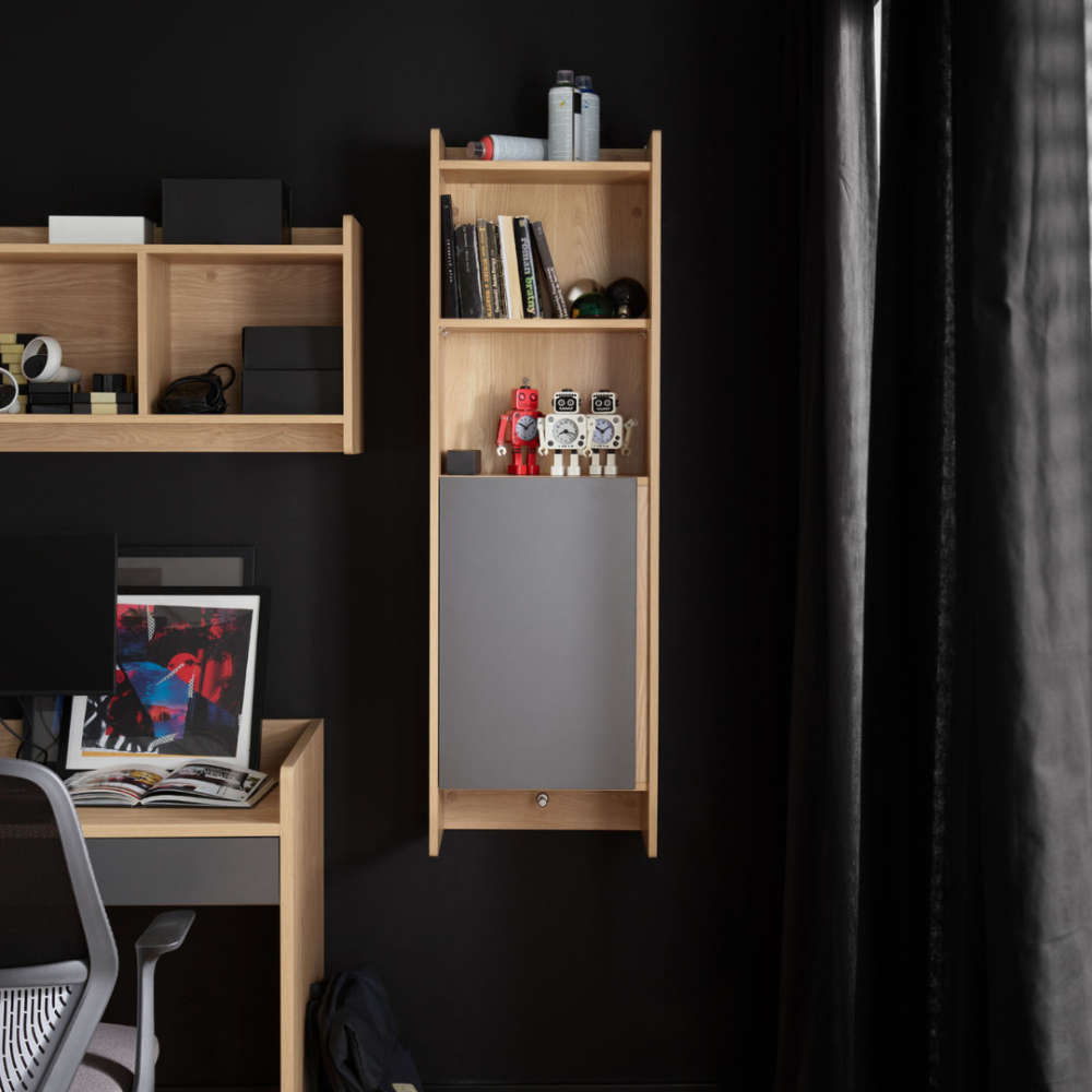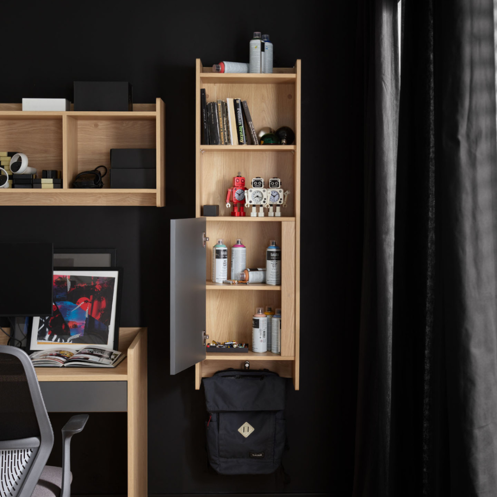 Šī ir mēbele, ar kuru funkcionāli iekārtosiet bērna istabu un ietaupīsiet vērtīgu grīdas platību. Atvērto plauktu un slēgta skapīša kombinācija ļauj gudri organizēt telpu, un papildu āķis ļauj pakārt mugursomu. Plaukta krāsu var pieskaņot izkārtojumam. Muve piekaramajam plauktam ar durvīm ir divas atvērtas vietas, kas ir ideāli piemērotas iecienītāko priekšmetu izvietošanai. Tieši aiz durvīm atrodas plaukts ar regulējamu augstumu. Piekļuvi skapītim nodrošina fasāde ar klusas aizvēršanas sistēmu. Mēbeļu montāžas posmā varat izlemt par durvju atvēršanas virzienu. Tādējādi Muve piekaramo plauktu ar durvīm- var pakārt galda kreisajā vai labajā pusē.Muve piekaramā plaukta augšdaļu var izmantot kā papildu plauktu. Tam ir iebūvētas sānu malas un aizmugure, tāpēc nekas nenokritīs uz grīdas.