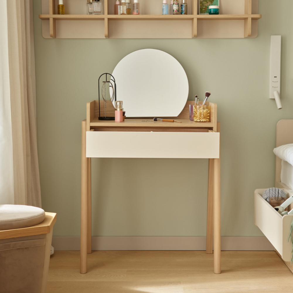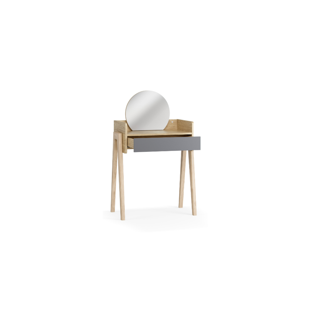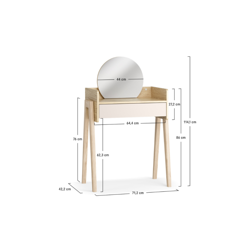 Pateicoties ietilpīgajai atvilktnei, visa kosmētika, rotaslietas un mazie aksesuāri atradīs savu vietu, un kārtība tiks uzturēta bez piepūles. Noliecams apaļais spogulis ar apgaismojumu garantē ideālus apstākļus kopšanai un grima uzklāšanai. Mazais izmērs nozīmē, ka tualetes galdiņš labi kalpos arī kā rakstāmgalds, apvienojot funkcionalitāti ar vietas taupīšanu. Gudri risinājumi nozīmē, ka nepieciešamības gadījumā tualetes galdiņš var kalpot kā neliels rakstāmgalds. Zem tās augšdaļas ir plata atvilktne, kas aprīkota ar vadotnēm un klusu aizvēršanās mehānismu. Tā ir ideāla vieta kosmētikai, rotaslietām vai mācību piederumiem.